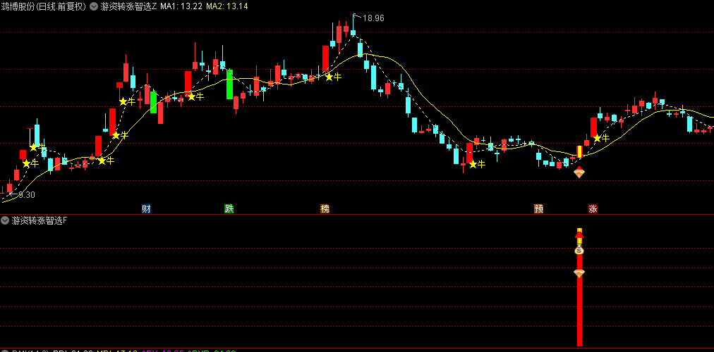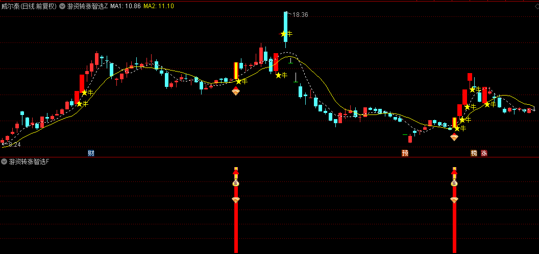 -通过成交量的变化和价格波动特征,识别游资可能介入的股票,并在主图上用黄色“★牛”标记,提示潜在机会。