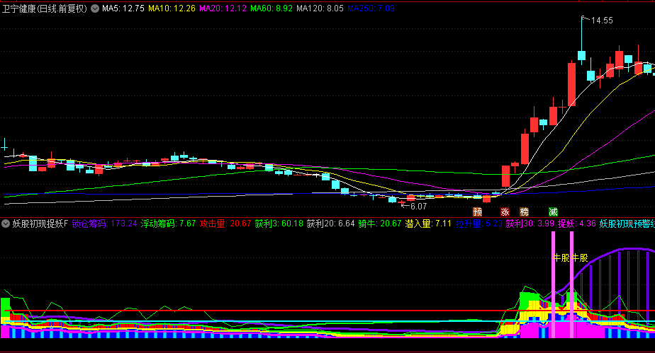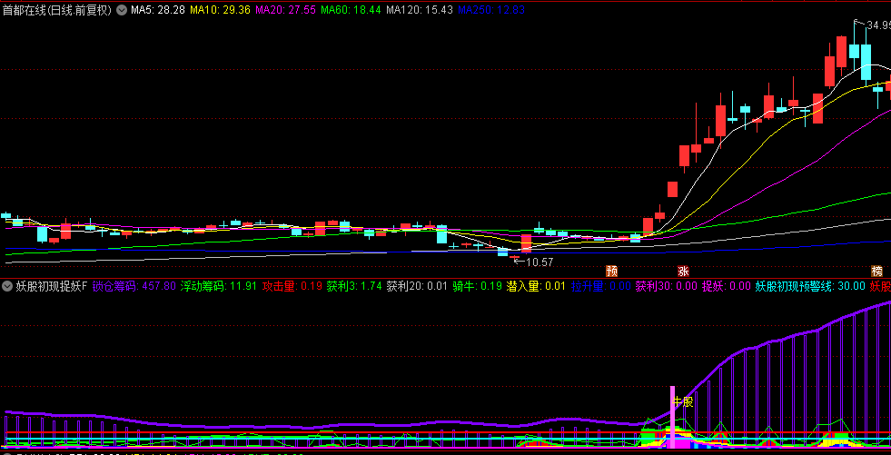 -在实际操作中,投资者可以通过副图指标实时监控锁仓筹码、浮动筹码、攻击量、拉升量等指标的变化情况,结合妖股初现预警线和妖股极端预警线,及时捕捉妖股的启动信号。