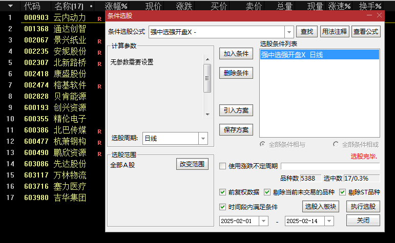 超短线最困惑的就是开盘瞬间选股,为了解决这种困惑并快速盘前选股心仪股票,特发此强中选强预警公式