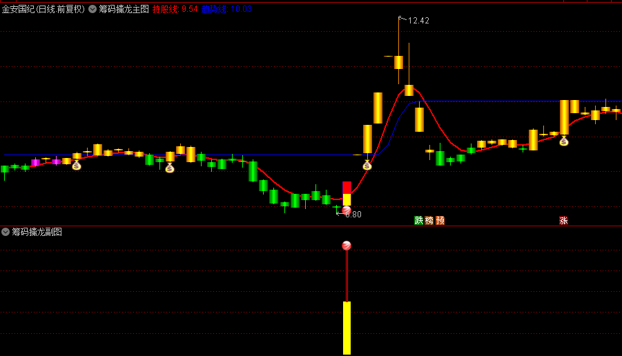 当市场出现强势“盘龙”形态时,若伴随“红色圆球”信号,表明市场正处于强势上升通道,是加仓或持有的好时机。