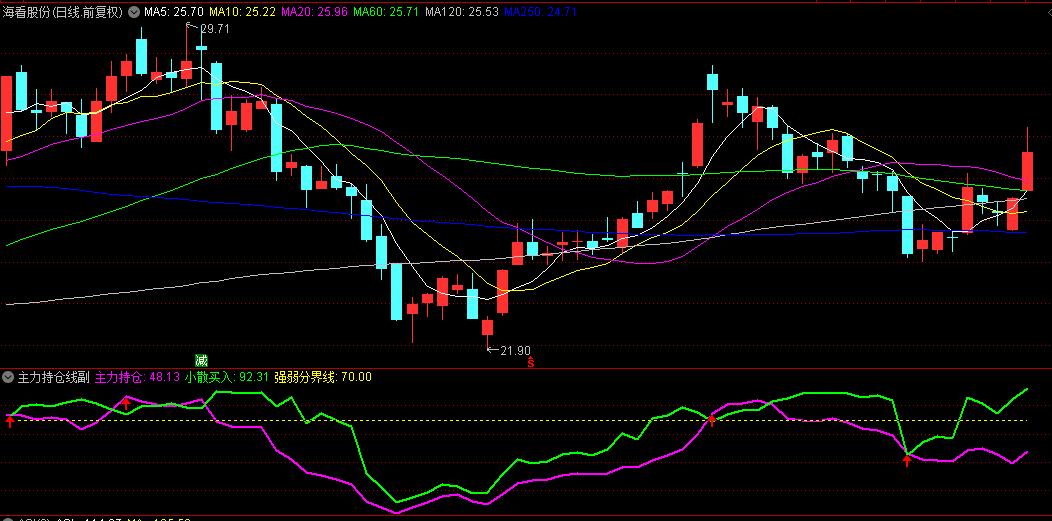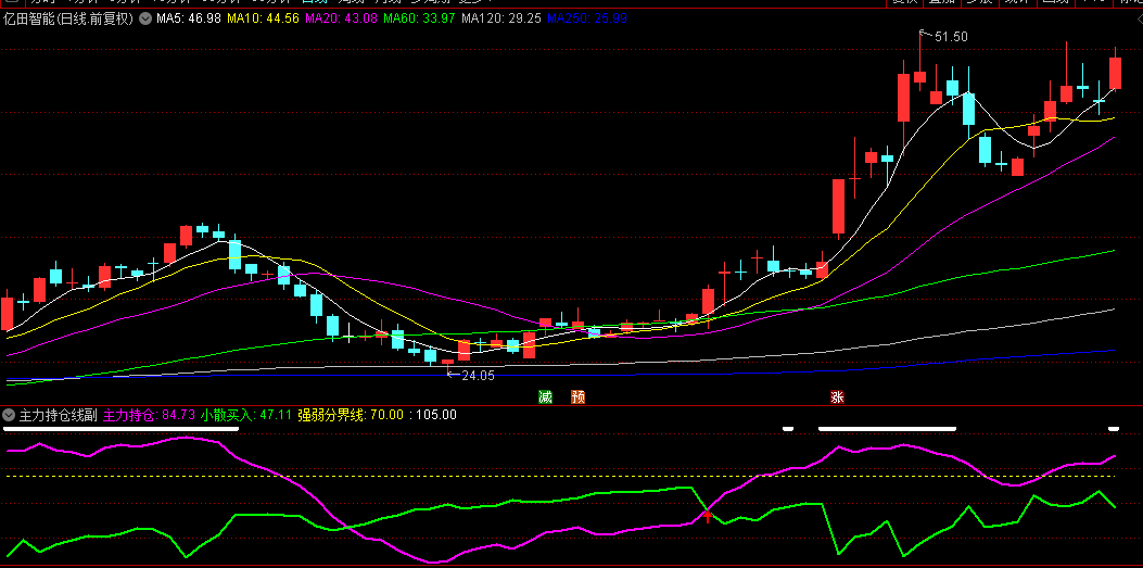 -紫色曲线:代表主力持仓线,展示了主力资金的筹码积累趋势。
