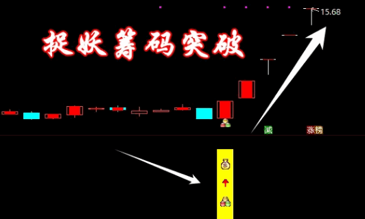 随着筹码的逐步积累,红色箭头和“钱袋子”图标出现,这些被视为买入信号或主力资金进场的标志,通常预示着主升行情的启动。