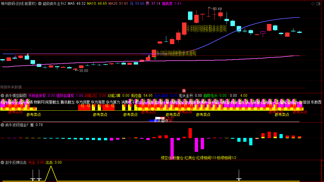 疯牛模型副图通过多层次的EMA计算,结合大盘指数和个股的共振效应,捕捉强势起爆点。