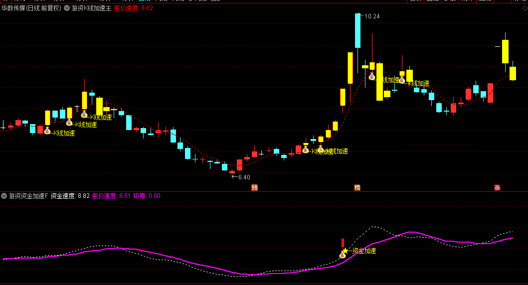 通达信【游资K线加速】主图+【游资资金加速】副图+【游资K线加速】选股指标,判断游资是否正在加速介入!
