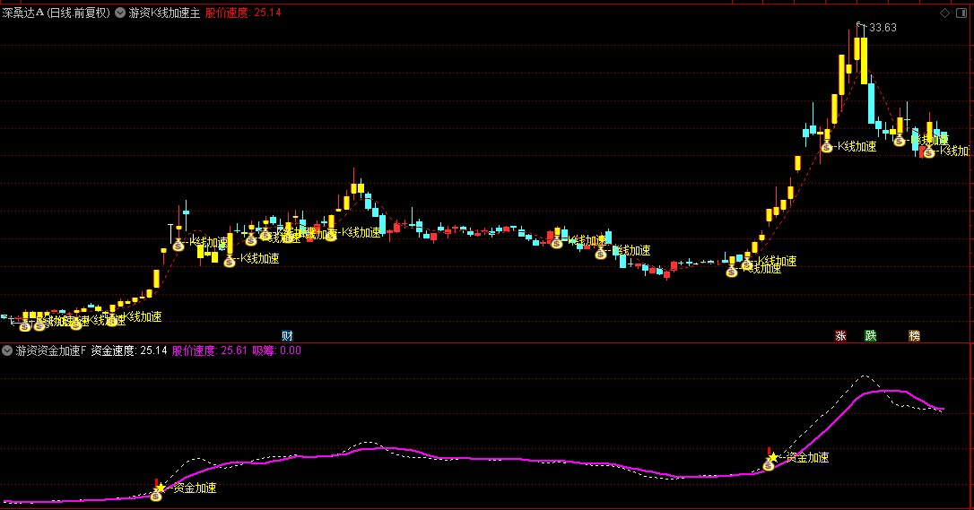 【游资资金加速】副图主要从资金流向的角度,结合股价的短期波动,帮助投资者识别游资的资金加速介入信号。