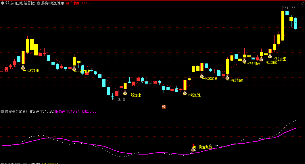 主图通过黄色K线和“K线加速”文字提示,帮助投资者快速识别游资介入的个股,适合短线交易者使用。