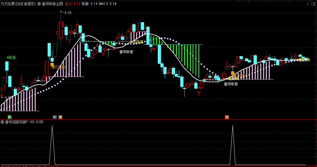 当绿色帘低垂时,预示着明媚的阳光即将被乌云遮盖,随之而来的阴雨绵绵,反映在股票上就是阴多阳少或者连续阴跌,这可不是踏青赏绿的时候,而是止盈止损保住钱袋子,这才是英明的选择。13日线也就是白色线,它是介于13日至21日之间的交汇点,反映在图上就象一个圆弧底或平底,只要股价由锅底外运行到锅底内,即股价由均线下方运行到均线上方,K线以小阴小阳最佳,(阳多阴少更佳),无量做锅底最好。