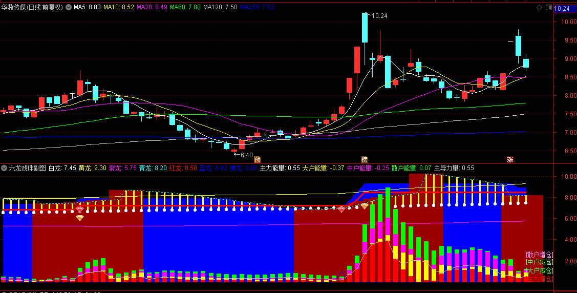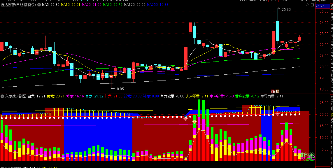 -买卖信号:当蓝龙上穿青龙且能量柱显示主力资金增仓时,是较好的买入时机;当蓝龙下穿青龙且主力能量为负时,可能是卖出或减仓的信号。