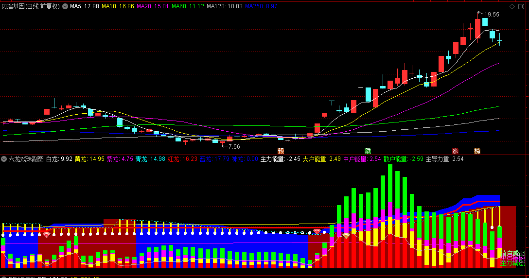 -白龙:白龙是125日的收盘价均线,代表长期趋势。它是五龙中的基准线,反映了市场的长期走势。