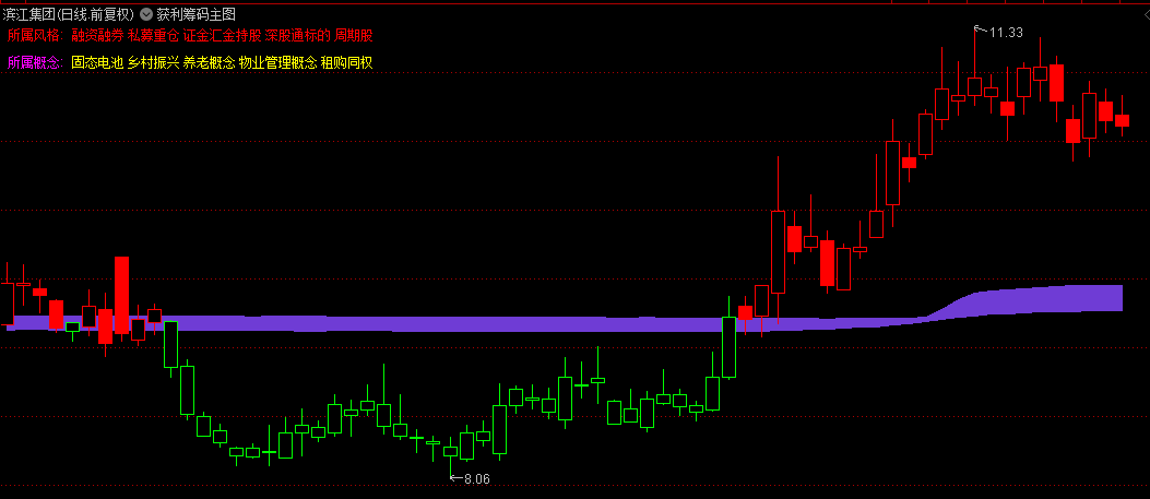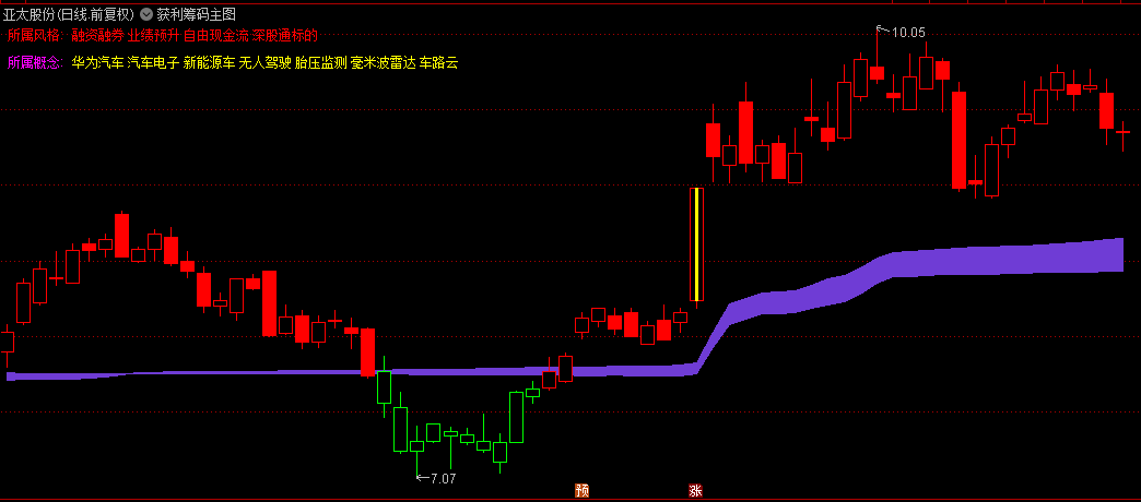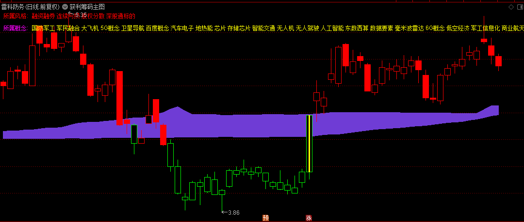 特别是K线回踩获利筹码趋势带时,往往就是主力**的时候,用《获利筹码主图》就能一眼看穿主力意图,待K线回踩不破时就是和主力一起吃肉的时候。