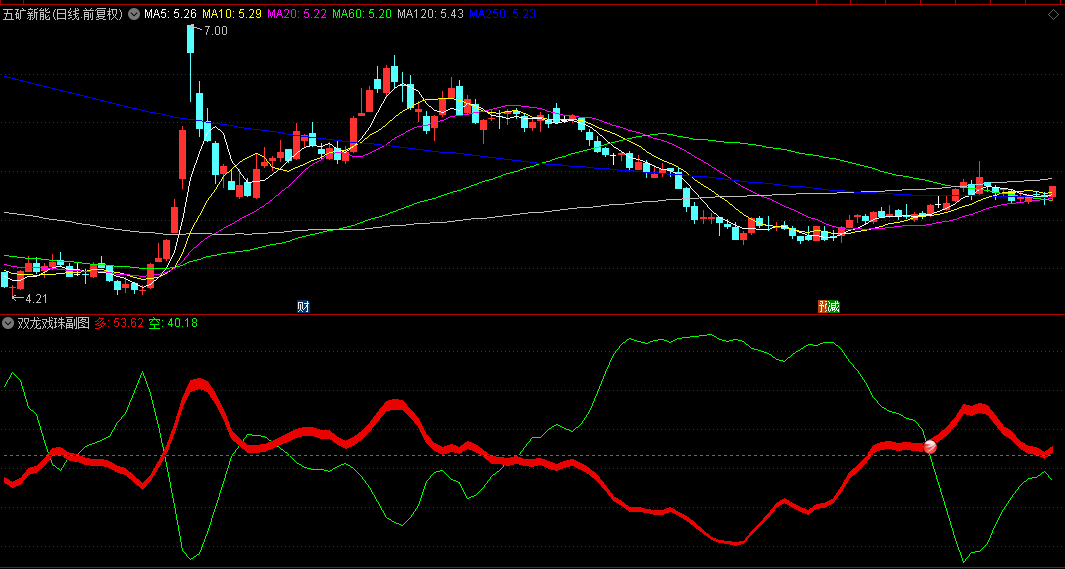 在图示中,红色的带状线条象征着多头力量的强弱及趋势,而绿色的曲线则反映了空头力量的动态;