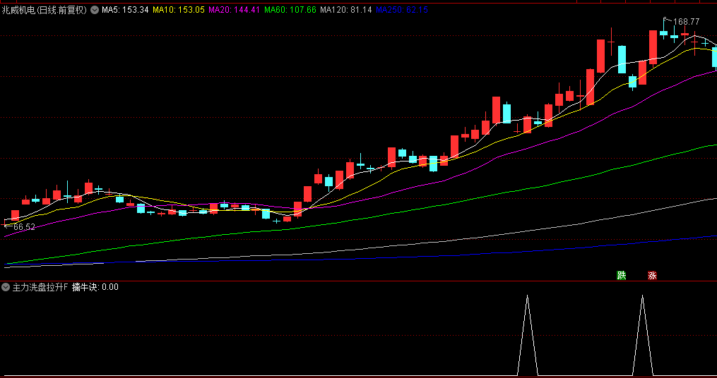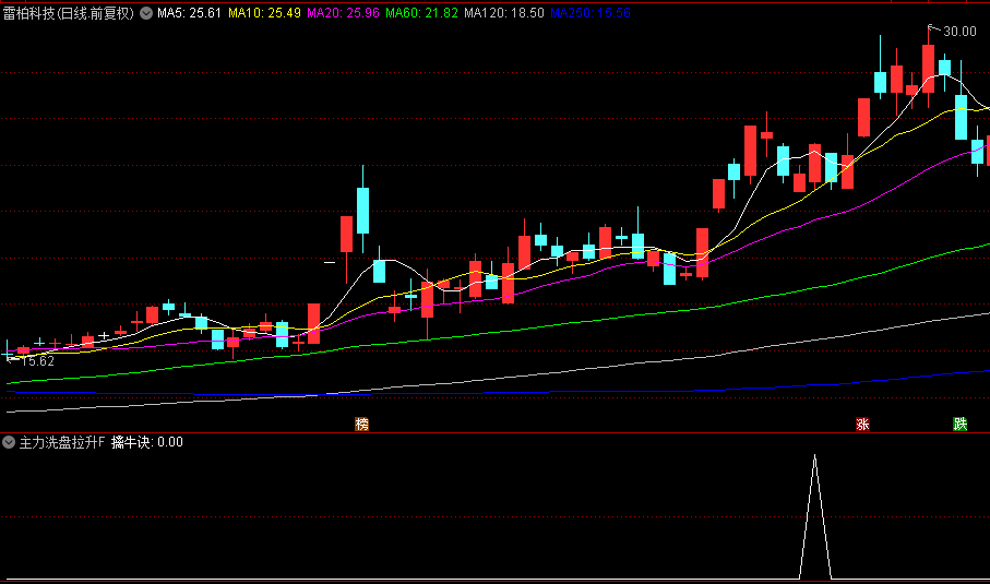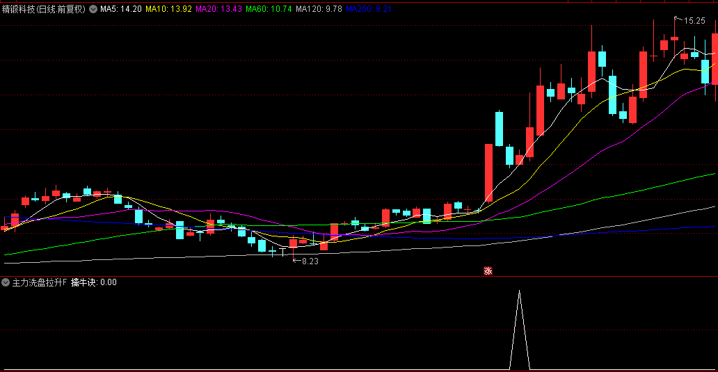 2.上下影线组合:前三天内出现过前一天长上影、第二天长下影的组合,这种形态通常预示着主力洗盘的结束。
