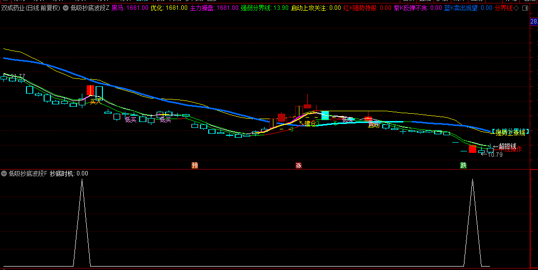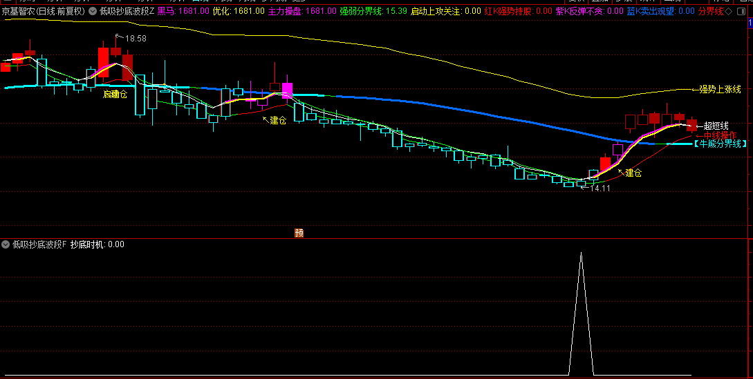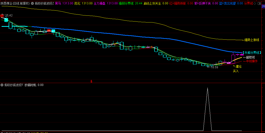 副图部分主要用于识别波段底部,帮助投资者在市场回调时找到低吸的机会。核心功能包括: