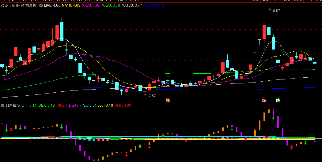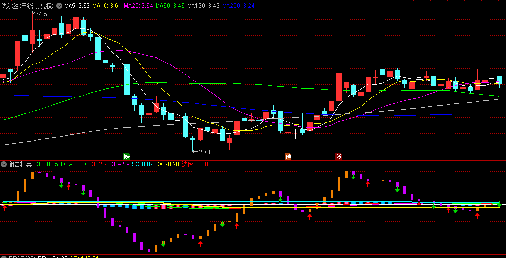 4、若个股出现绿色箭头,表明该股已达到阶段性高点,此时应考虑减仓或出货。若此情况发生在棕黄色区域,则是减仓的信号;若棕黄色柱状图缩短且紫红色柱状图即将出现,那么此刻便是出货的最佳时机。