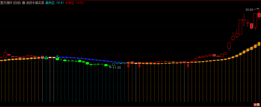 当股价上穿牛市区时,发出买入信号,提示投资者市场可能进入强势阶段;