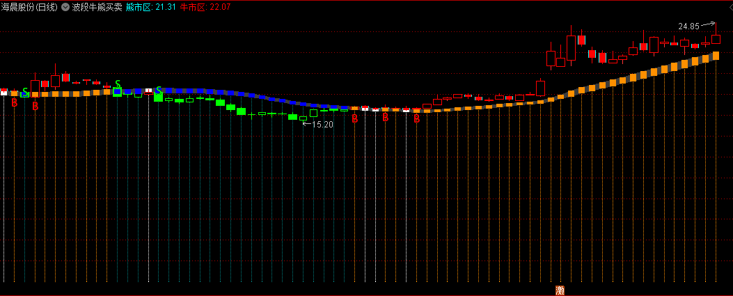 通过STICKLINE函数,指标在K线图上动态绘制了牛熊市区的分界线,并以不同颜色区分多空力量。