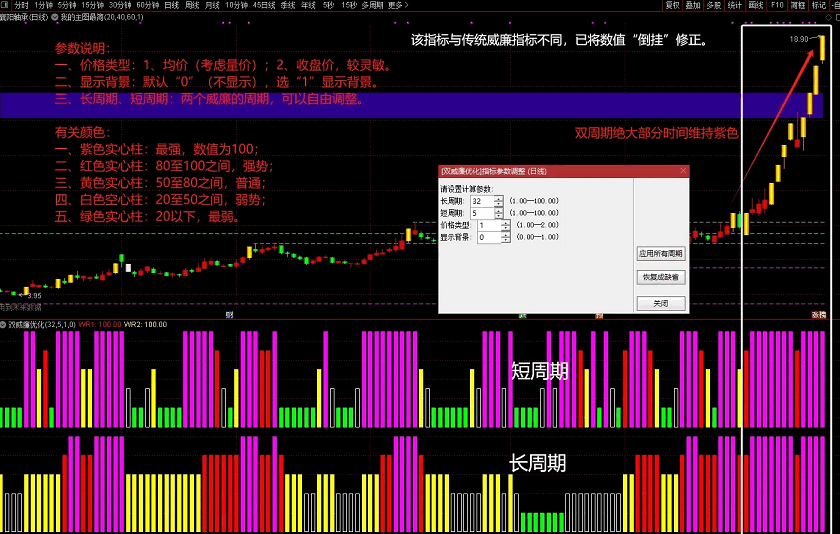 为此,我们特别优化并推出了【双周期威廉】指标,通过引入长周期与短周期的双重计算,