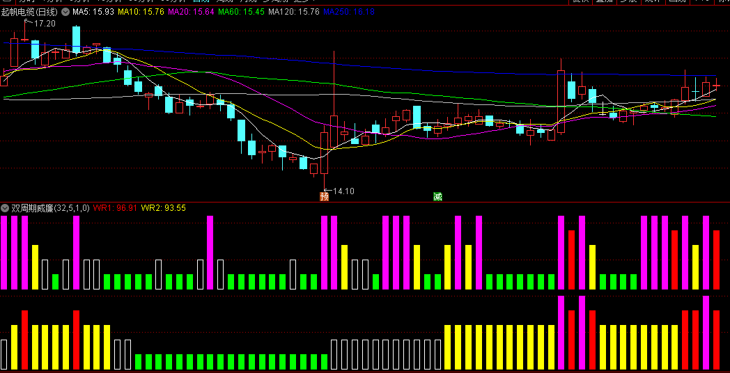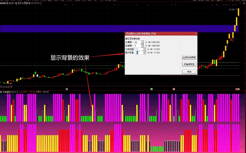 指标通过不同颜色的柱状图(红色、黄色、白色、绿色、洋红色)直观展示威廉指标的数值区间,帮助投资者快速判断市场状态: