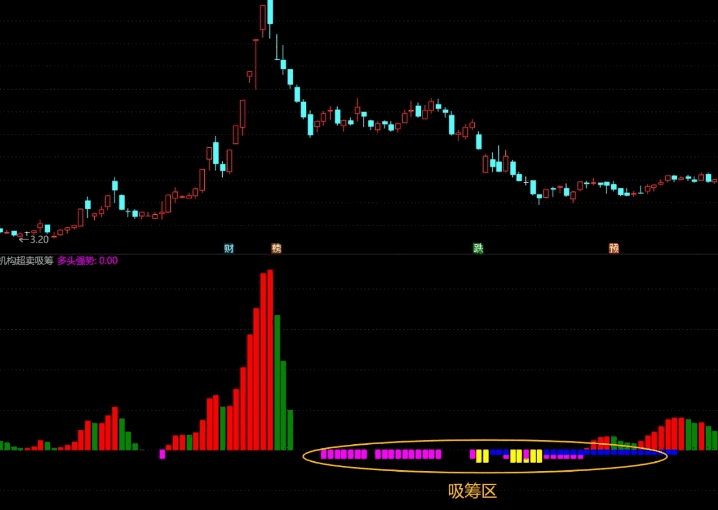 图中下半区为吸筹区,超跌区,3种不同指标进行检测,分上周颜色显示。