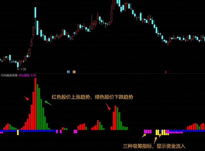 图中上半区是股价走势趋,上涨趋势显示红色,下跌趋势显示绿色,指标判断无明显机会则不显示。