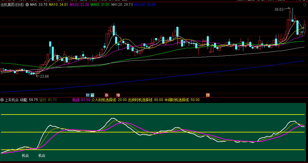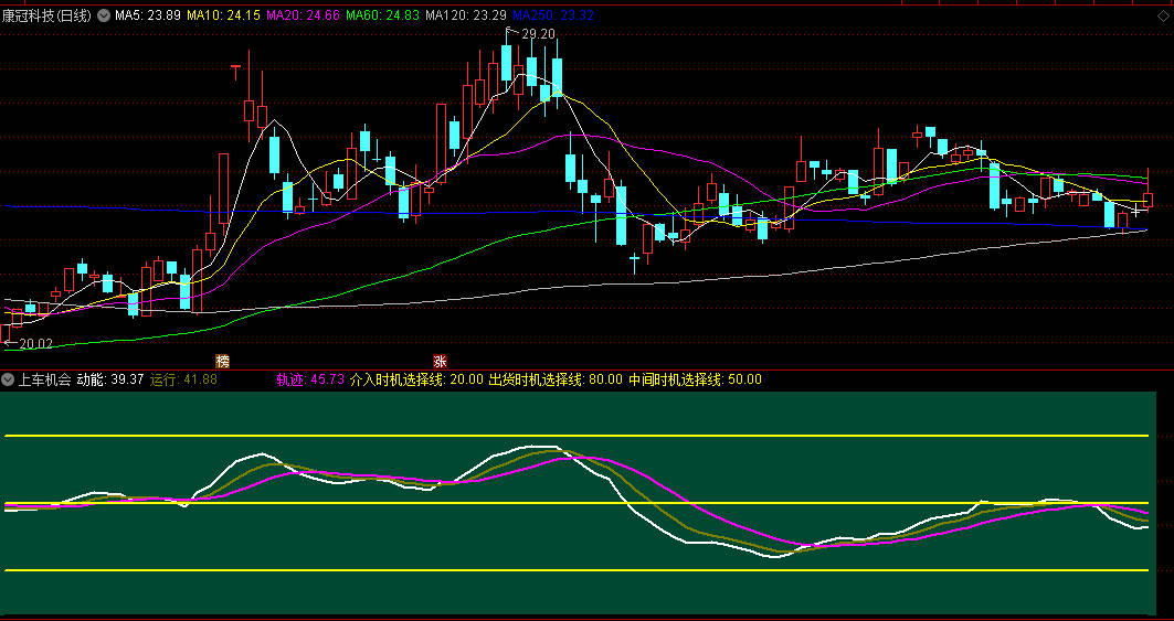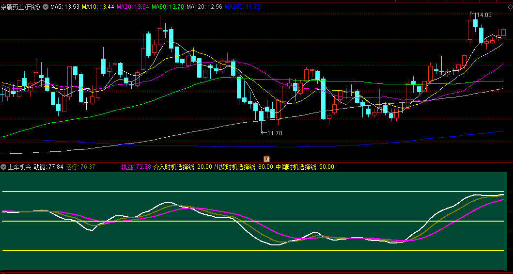 介入时机选择线(20):当动能线从下方突破该线时,可能是买入信号。