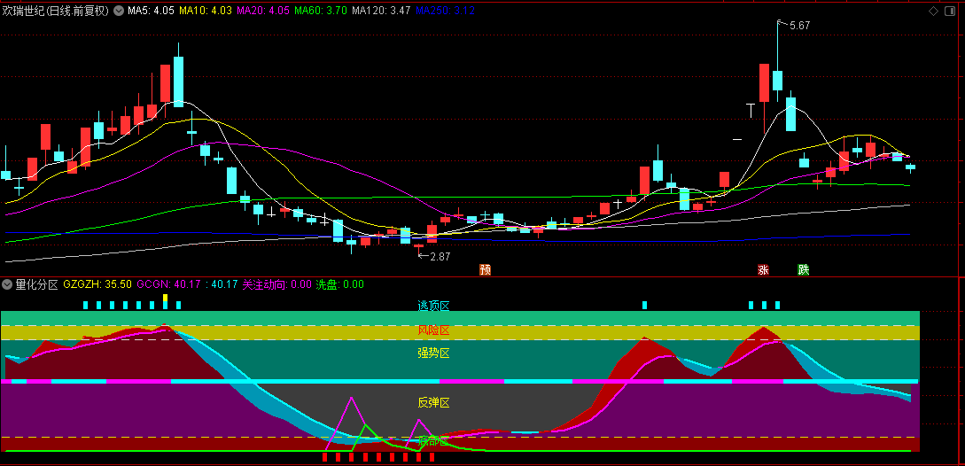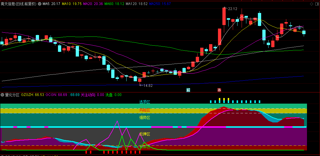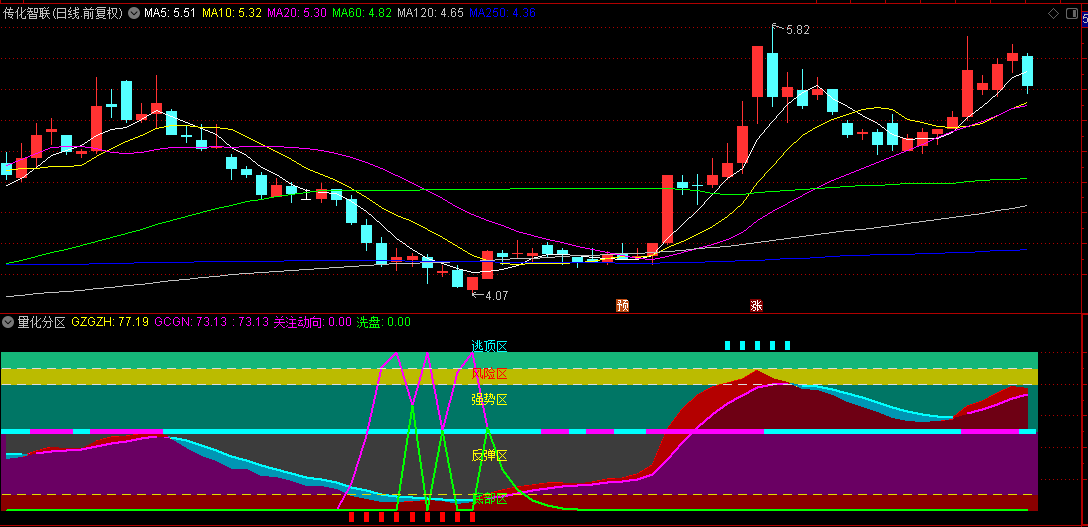 该指标分底部区,反弹区,强势区,风险区和逃顶区。