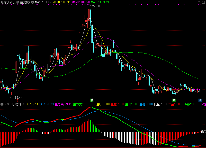 低金:CROSS(DIF,DEA) AND DIF<-0.1,COLORWHITE,NODRAW;