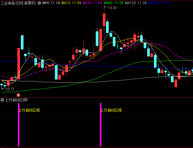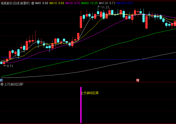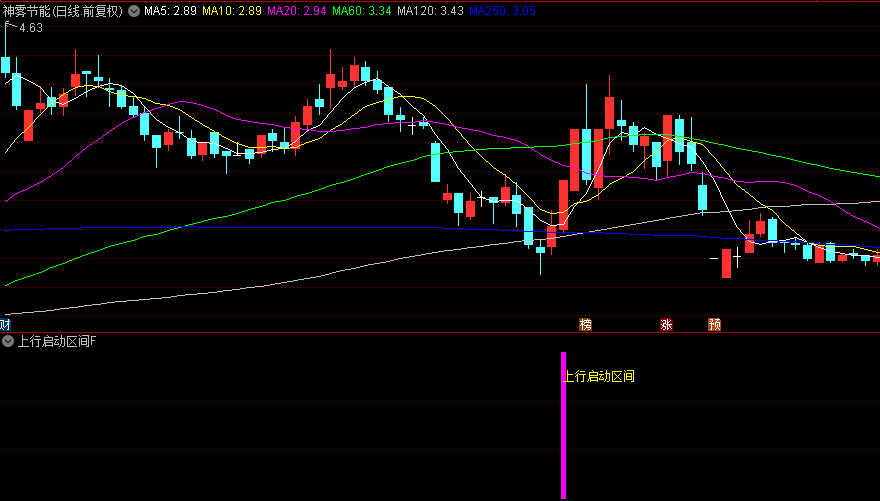 在副图中,指标会通过彩色柱状线和文字提示来标注“上行启动区间”的信号。