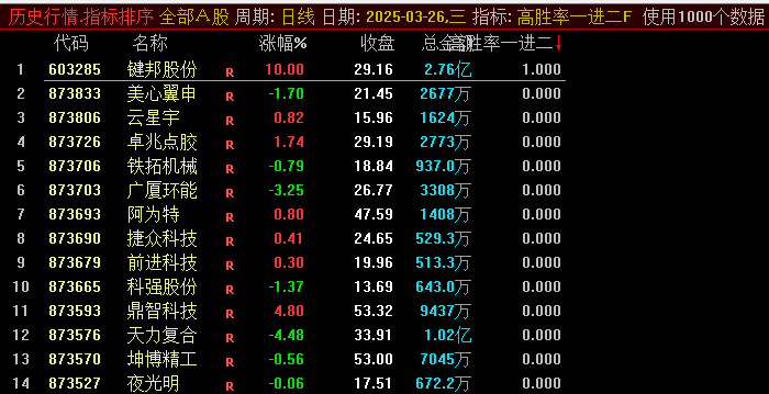 3、排序方法:早盘打开通达信软件—行情—–全部A股—–输入 .401 —–历史行情排序—-更改排序指标—-高胜率一进二!