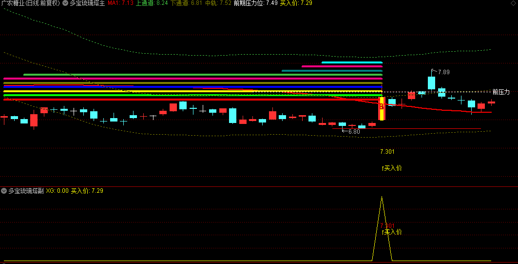 当主图出现黄色买入箭头且副图选股信号同步出现时,结合前期压力位标记,在股价回踩七彩支撑带时介入。
