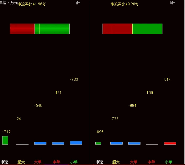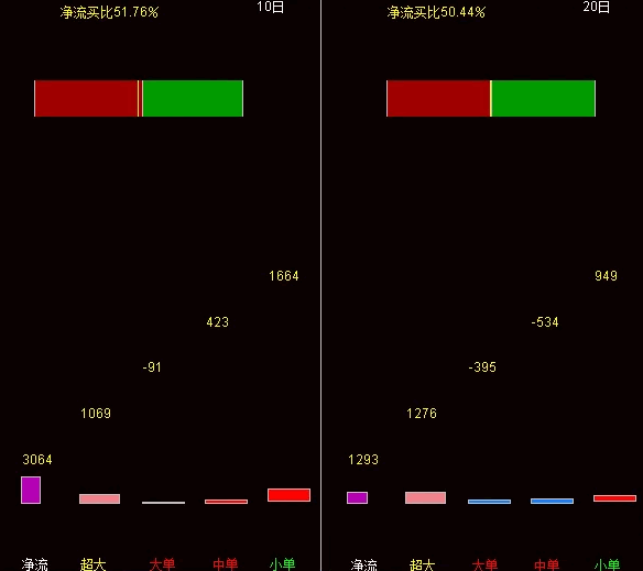 指标将资金流细分为多个维度,通过不同颜色柱状图直观显示: