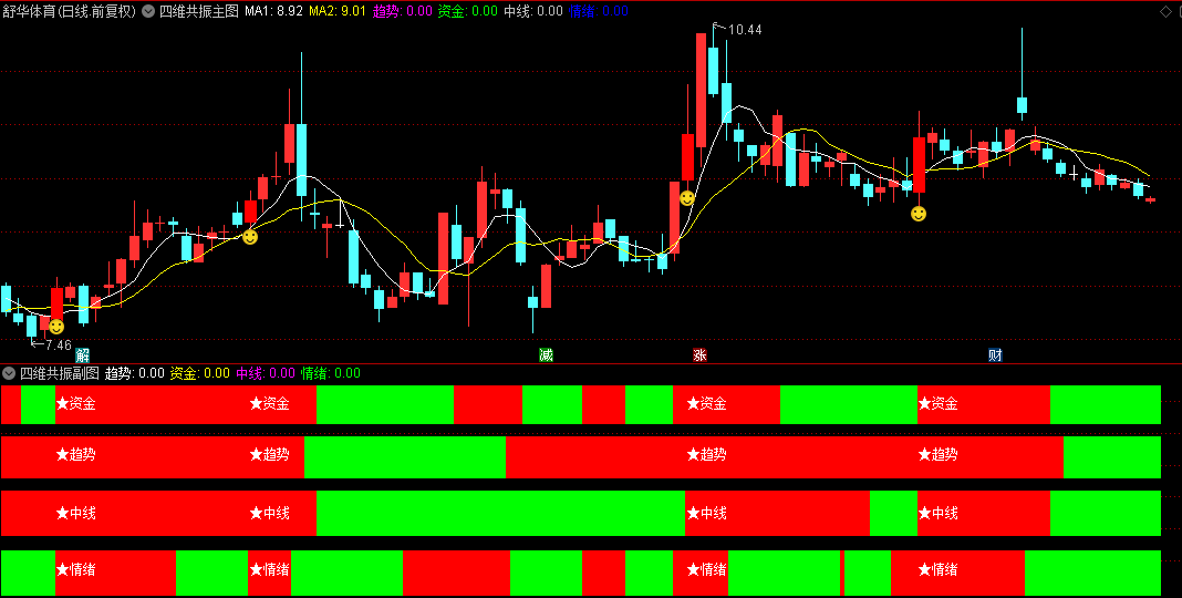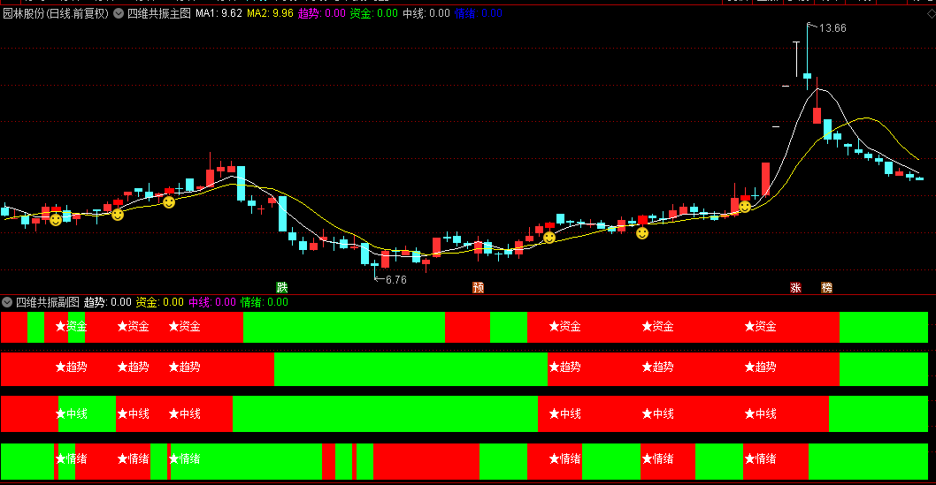 通达信【四维共振】主图/副图/选股指标,资金+趋势+中线+情绪,形成买入决策强信号