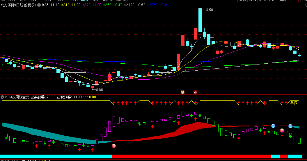 双周期共振:周线金叉(K上穿D)与日线金叉同步出现,标记共振信号
