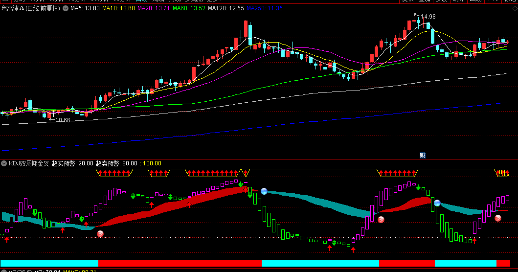 采用双色可视化设计:周线KDJ以红色系显示(K线红色,D线粉红,J线绛红)