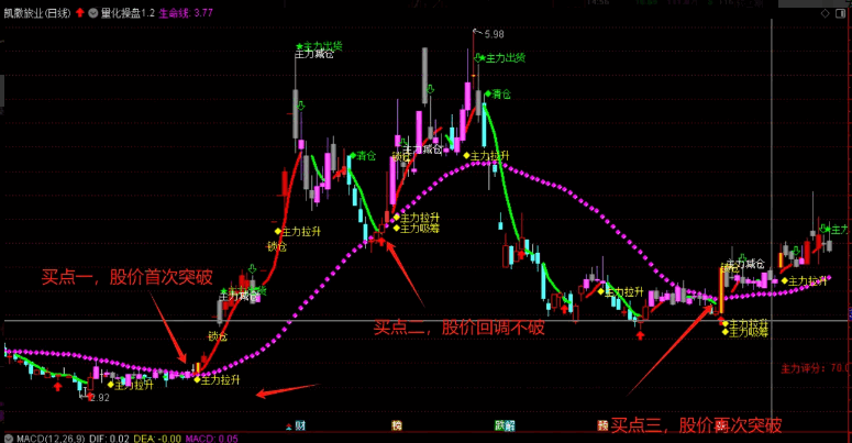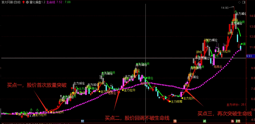 买点二,回调到生命线附件时,不跌破生命线考虑买入。