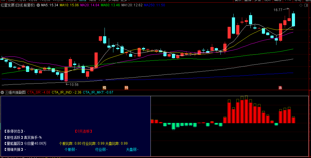通达信【三强共振】副图指标,个股+行业+大盘共振,量能红柱爆发,加速板启动!