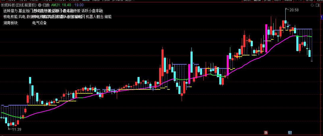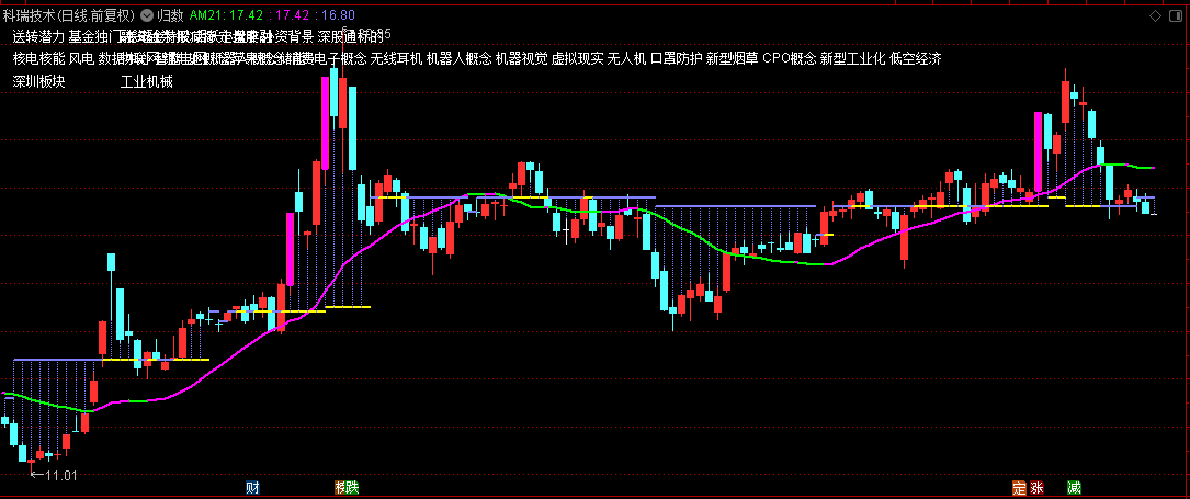 统一回复:因为每根K线只能出一根筹码峰水平线,所以没办法完美显示多峰的情况。所以在上涨过程中,还要参考当日整个筹码分布情况。当水平线连续出在顶部时一般就是要出货了。水平黄线呈延长线时,可以认为底部筹码锁定。