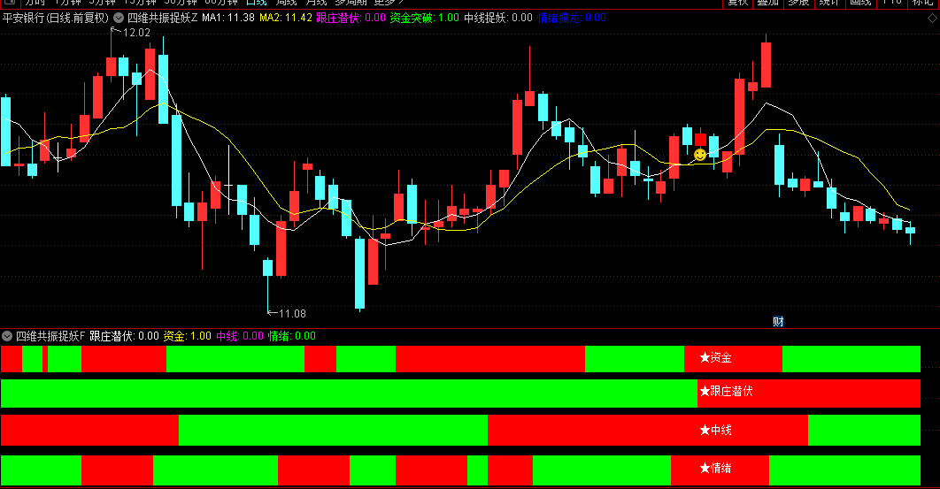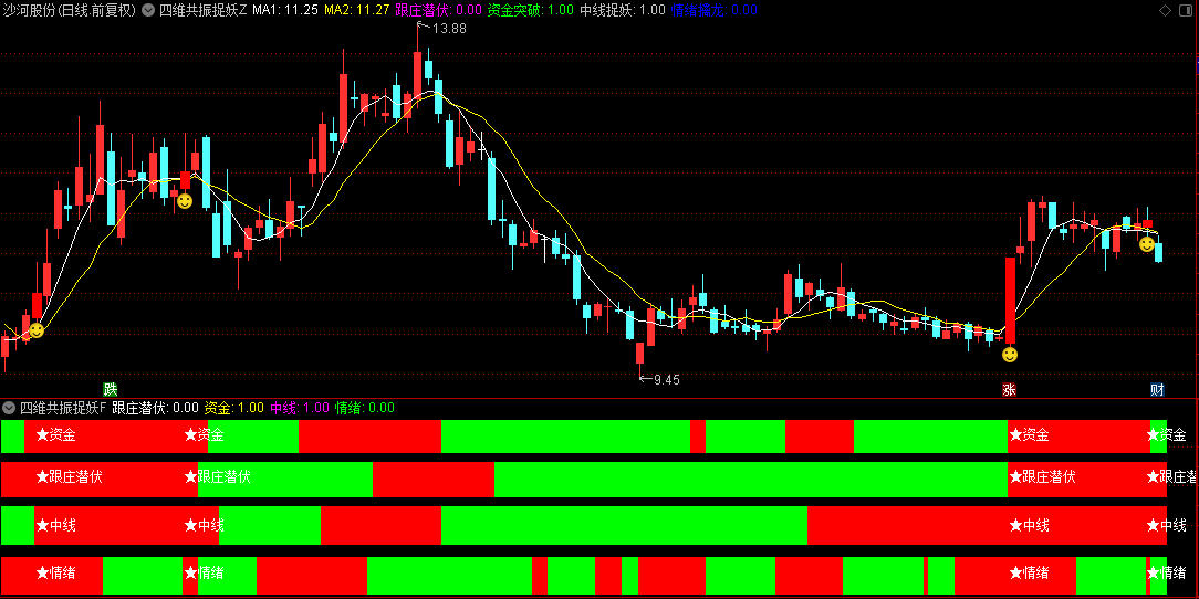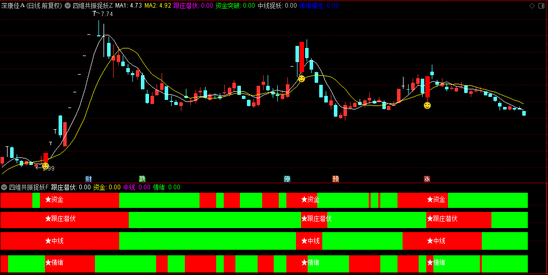 【四维共振捉妖股】主图/幅图/选股指标,四维同步显红时触发笑脸信号,形成买入决策强信号!