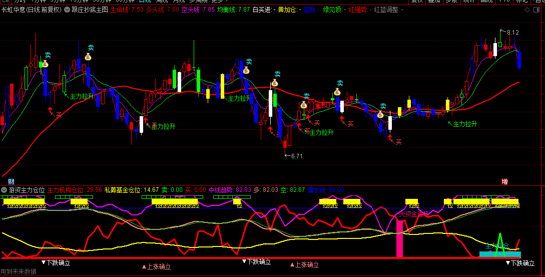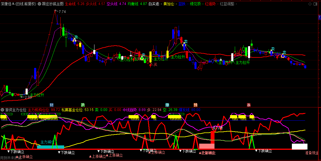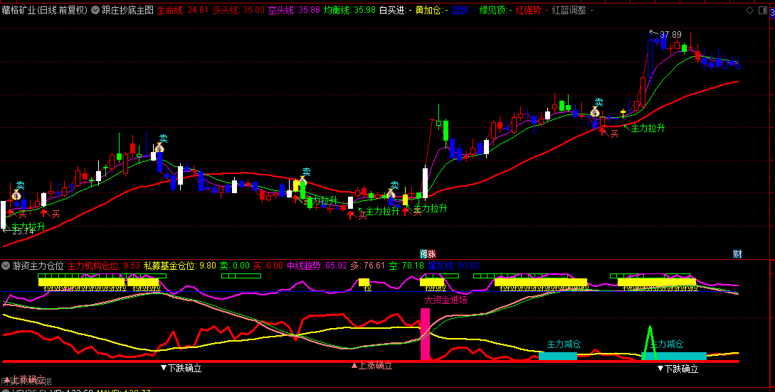 本套指标系统由主图跟庄抄底和副图游资主力仓位组成,融合了均线理论、量价分析和主力行为识别三大技术体系,专门用于捕捉主力建仓阶段的黄金买点。