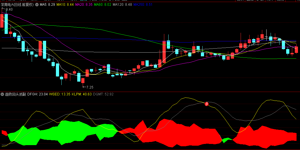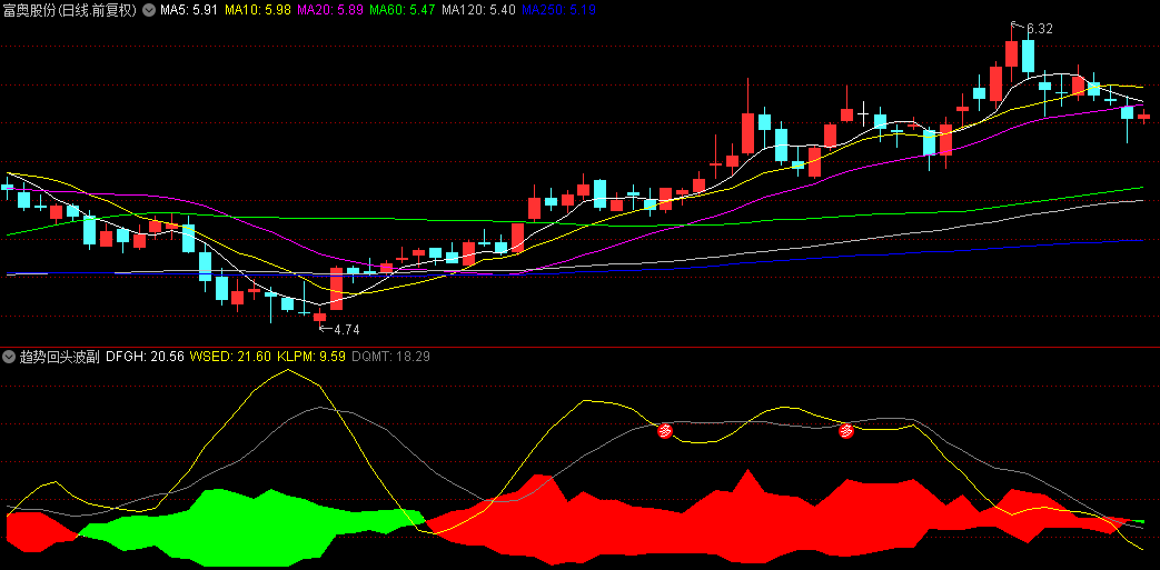 趋势回头波幅图中红绿色的区间分别代表多头区间和空头区间,两条曲线代表的是多头和空头的趋势强弱,黄色线金叉灰色线是强势,死叉是弱势;不含未来函数!