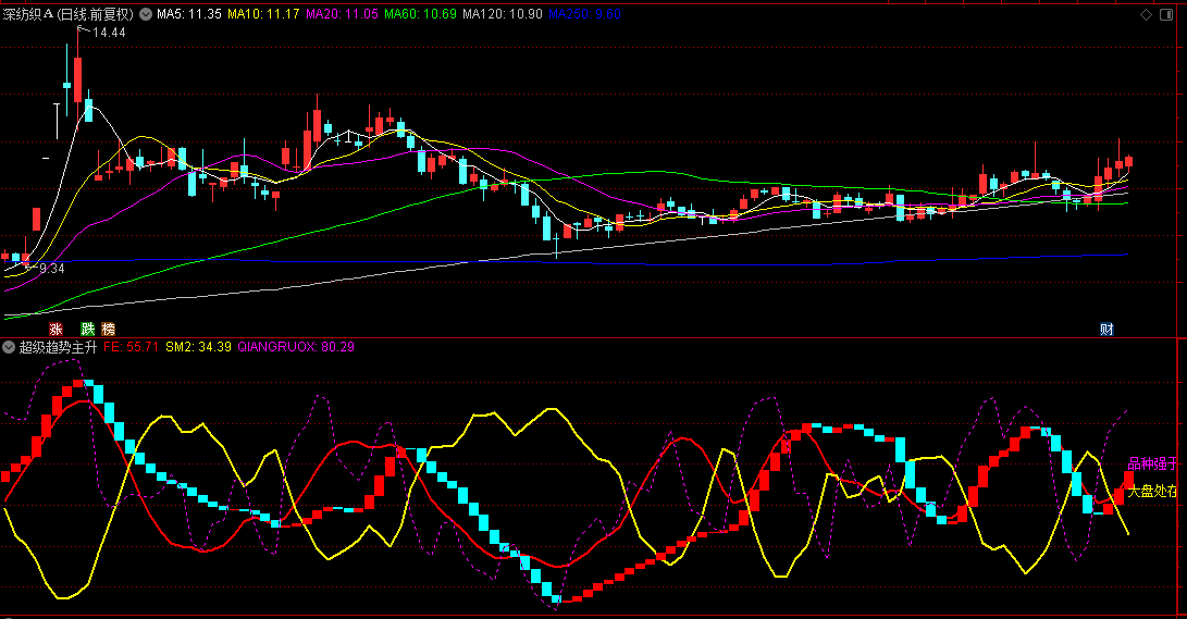 借助DRAWTEXT函数,该指标能在图表上直观地显示文字提示,如“品种强于大盘指数”、“大盘处在上升通道”等。这些提示就像是在复杂的地图上标注出关键的路标,帮助我们快速把握市场状态,从而更高效地做出决策。