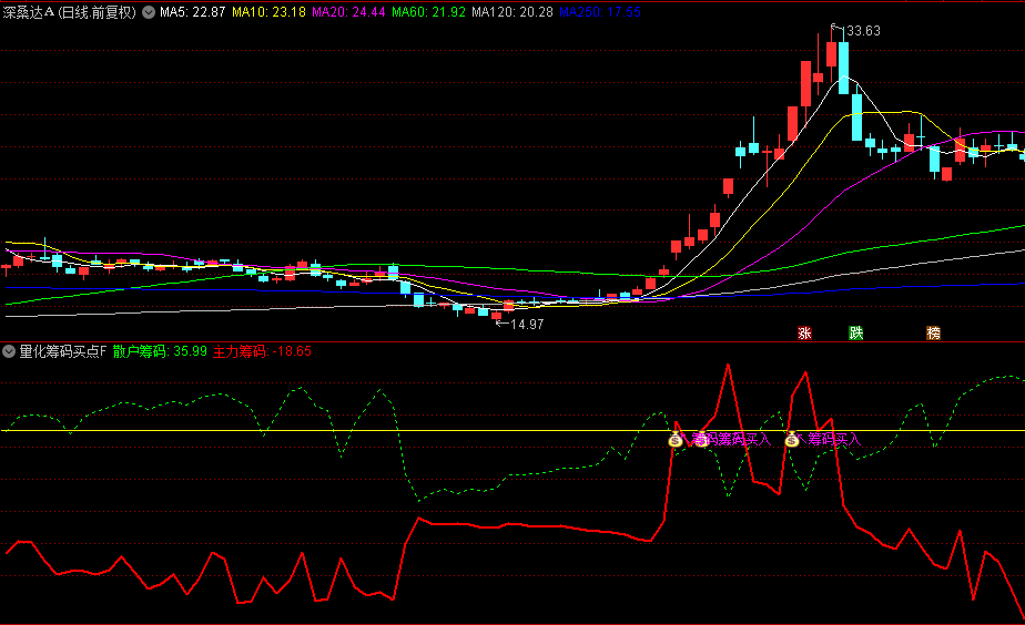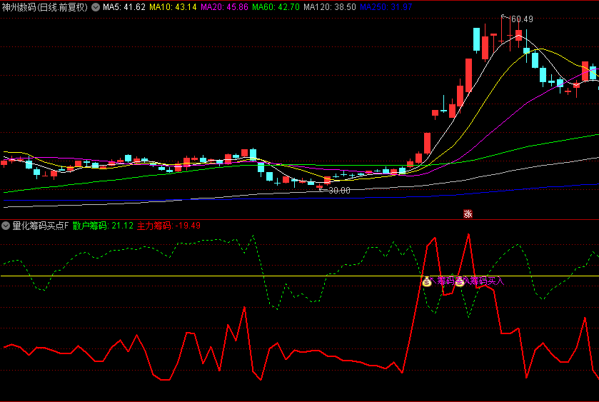 当主力筹码线向上穿越散户筹码线时,系统会自动生成"筹码买点"信号,以钱袋子图标显示。