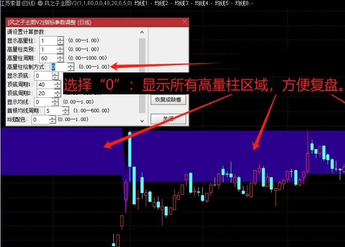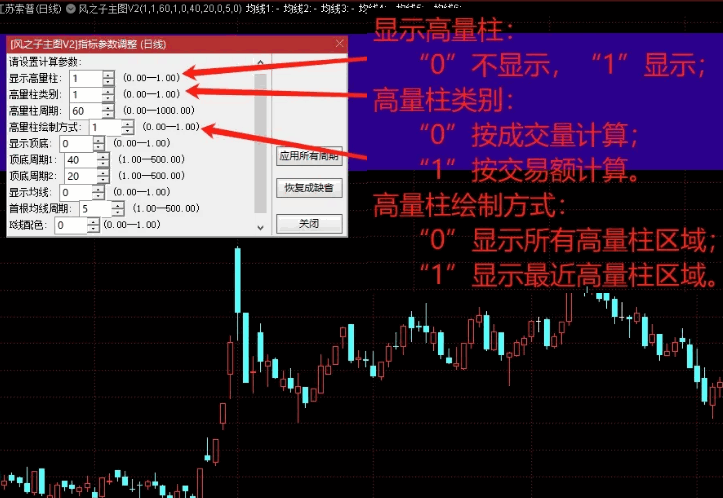 4、高量柱K线可设置计算方式(交易额或成交量)和绘制方式。