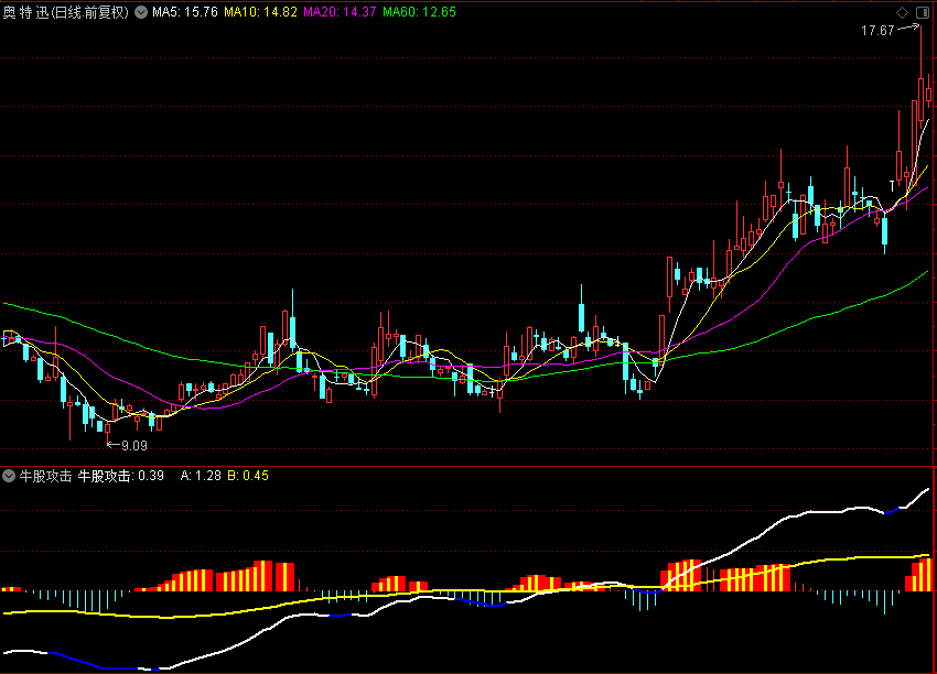 DIFF := EMA(CLOSE,12) - EMA(CLOSE,26); DEA := EMA(DIFF,9); 牛股攻击 : 2*(DIFF-DEA), COLORSTICK; STICKLINE(牛股攻击>REF(牛股攻击,1) AND DIFF>DEA,牛股攻击,0,10,0),COLORRED; STICKLINE(牛股攻击>REF(牛股攻击,1) AND DIFF>DEA,牛股攻击,0,1,0),COLORYELLOW; A: EMA(CLOSE,25) - EMA(CLOSE,65),LINETHICK2; B: EMA(DIFF,45),LINETHICK2; IF(A<REF(A,5),A,DRAWNULL)LINETHICK2,COLORBLUE;