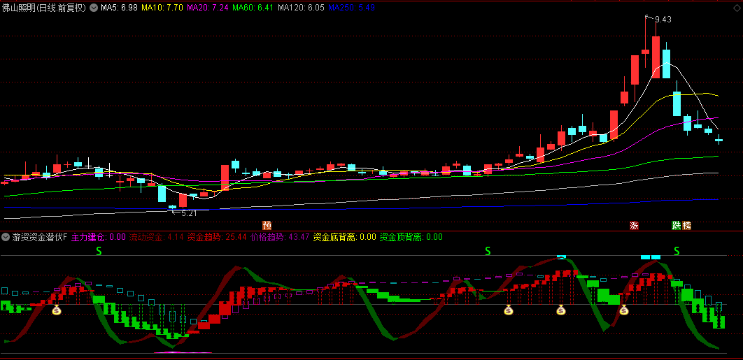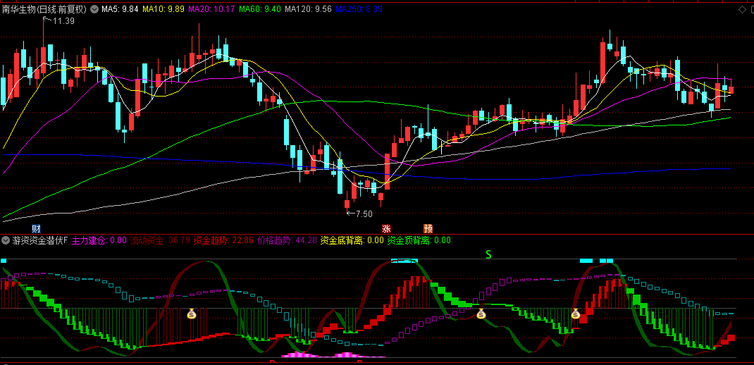 "资金潜伏"指标综合了多种市场分析和资金趋势的计算方法,可更全面地理解市场动态和资金流向。