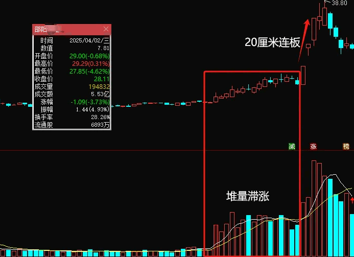 这是邵液压近期的走势,红色方框里面我们可以明显的看到,量能突然就爆出来了,