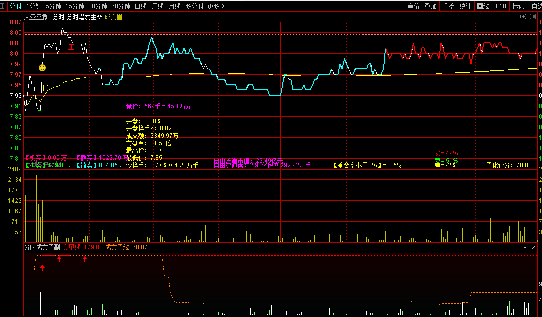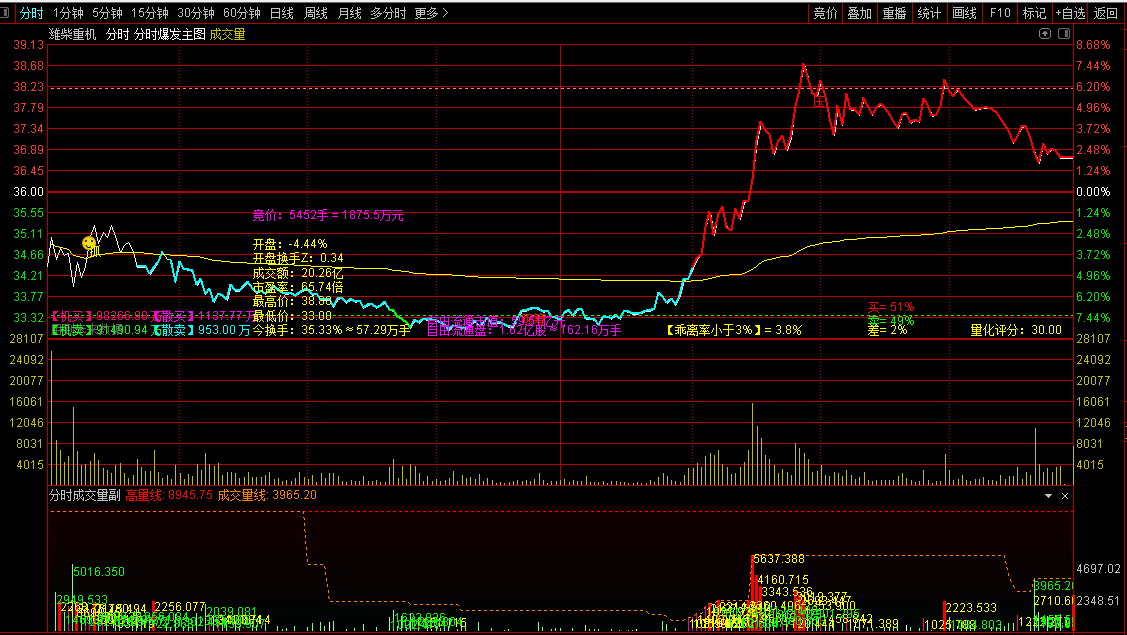 2、分时成交量,好公式网论坛独一份,可以从分时图上可视化看到资金的现实情况;流入为红色柱体+黄色资金金额显示,流出为绿色柱体+绿色自己金额显示;分时成交量显示当下最高的量能位置,意味短期突破信号;