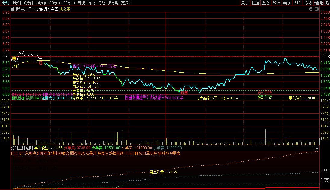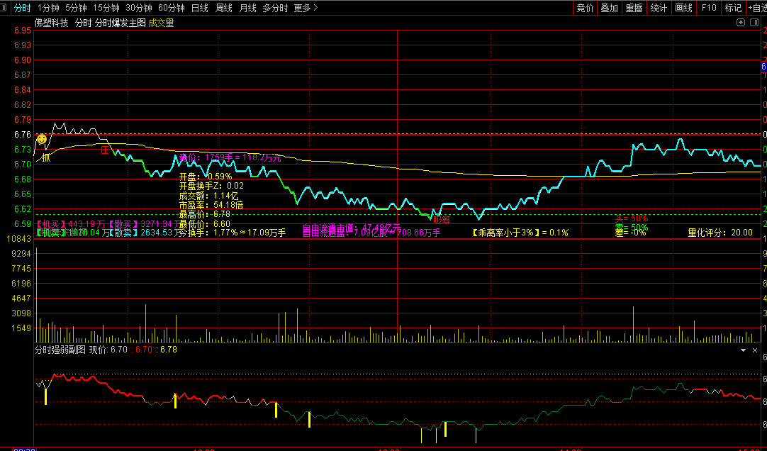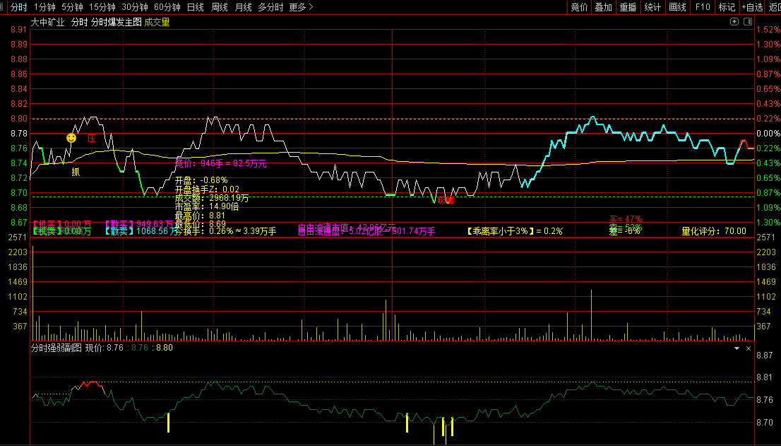 最佳状态:分时图股价线有红色或蓝色信号+分时成交量有红色柱体/大资金流入+分时量能有攻击信号/红色或橙色网格线+分时强弱有红色信号/橙色网格线。