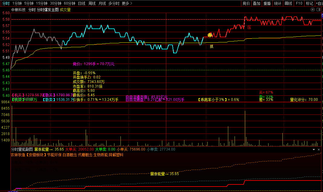 4、分时量能指标,异动攻击信号显示,暴涨量能信号提示,特别是暴涨量能大于15的最佳;同时显示大小单买卖的信号,红色为大单买入,绿色为大单卖;