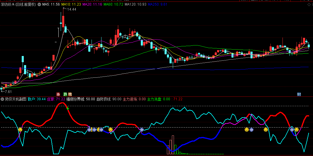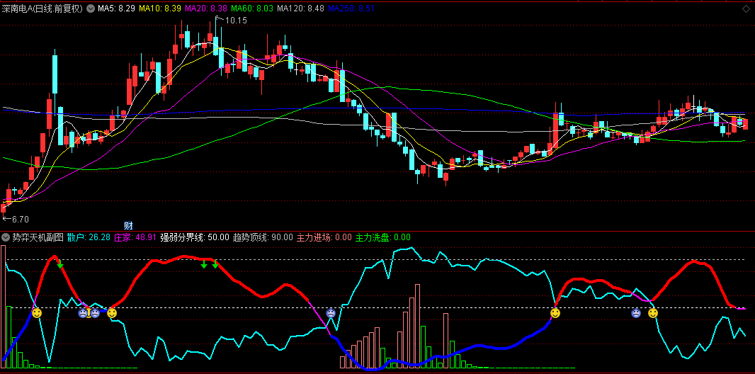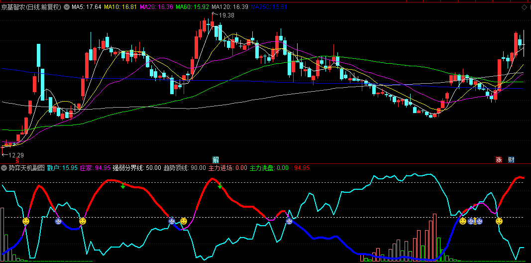 3. 趋势状态可视化:当庄家线上穿散户线出现“笑脸”信号买点,当庄家线由紫色变成红色粗线,表示阶段强势区域,当红线拉升后向下并出现“绿箭头”信号时,则考虑减仓或卖出,当继续向下出现“哭脸”信号时则必卖出。